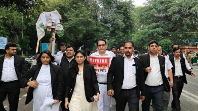 राउज एवेन्यू कोर्ट के बाहर वकीलों का प्रदर्शन, एलजी का पुतला जलाया