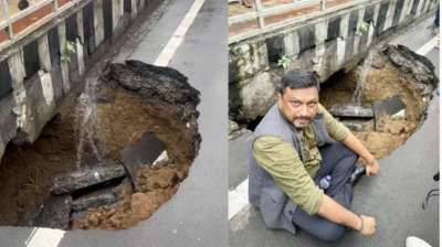 बोर्ड ऑफिस चौराहा में बारिश ने खोली सड़क की खामियाँ, लगभग 10 फीट गड्ढा