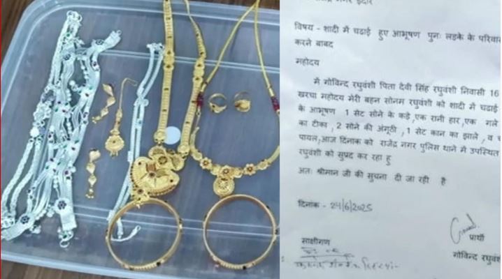 हनीमून के लिए शिलांग जाने से पहले सोनम रघुवंशी गहने मायके में ही छोड़कर गई थी। रतलाम में आरोपी प्रॉपर्टी ब्रोकर शिलोम जेम्स के ससुराल से बरामद बैग में केवल मंगलसूत्र ही मिला था। सोनम के परिवार ने जो गहने लौटाए हैं, उन्हें राजा रघुवंशी के परिवार ने मांगे थे। इसके बाद सोनम के भाई गोविंद रघुवंशी ने राजेंद्र नगर पुलिस थाने में रघुवंशी समाज के पदाधिकारियों की मौजूदगी में पढ़ा-लिखी के बाद विपिन रघुवंशी को सौंप दिया गया।