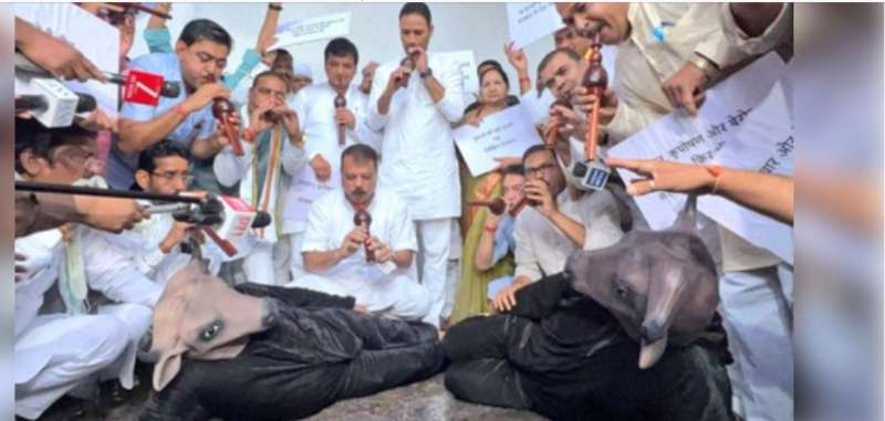 भोपाल। मध्य प्रदेश विधानसभा के मानसून सत्र का दूसरा दिन कांग्रेस के प्रदर्शन के साथ शुरू हुआ। कांग्रेस विधायक प्रतीकात्मक रूप से भैंस बने और उनके सामने अन्य विधायकों ने बीन बजाकर विधानसभा परिसर में प्रदर्शन किया। प्रदर्शन पर कांग्रेस विधायकों ने कहा कि मध्य प्रदेश सरकार भैंस की तरह सोई हुई है। अन्य पिछड़ा वर्ग को 27 फीसदी आरक्षण नहीं मिल पा रहा है। युवाओं को नौकरी नहीं मिल रही है, हम सवाल लगाते हैं, तो सरकार जवाब नहीं देती है. ऐसे में हम उसे बीन बजाकर जगा रहे हैं।