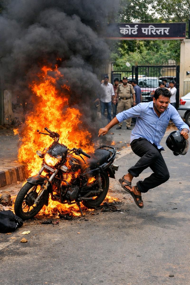 जिला न्यायालय के पास चलती बाइक बनी आग का गोला, मचा हड़कंप