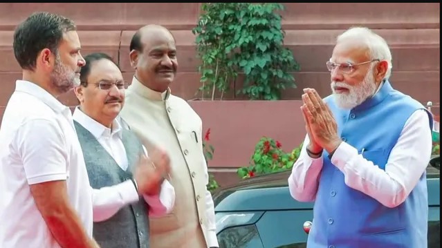 संसद परिसर में पीएम मोदी और राहुल गांधी की मुलाकात, हाथ मिलाकर हुई लंबी बातचीत